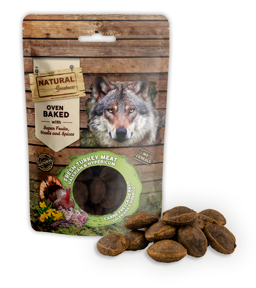 NATURAL GREATNESS Leckerlie, im Ofen gebacken, beruhigende Wirkung, 100g (Truthahn, Baldrian, Johanniskraut)