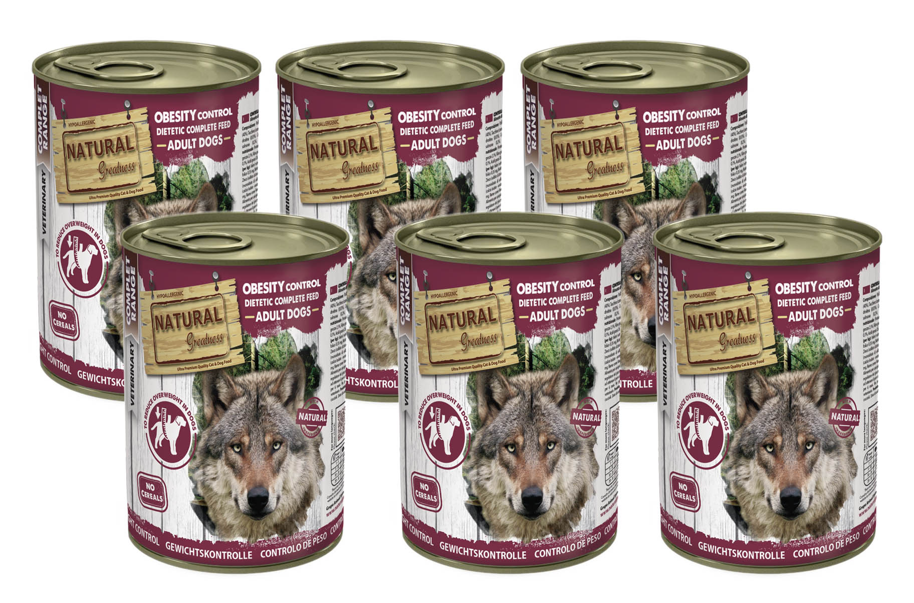 Natural Greatness Obesity Control ist ein vollwertiges, hypoallergenes, getreidefreies Nassfutter für junge und erwachsene Hunde aller Rassen mit Übergewicht oder Fettleibigkeit, Diabetes mellitus, Colitis, Verstopfung oder Hyperlipidämie in Verbindung mit Übergewicht.