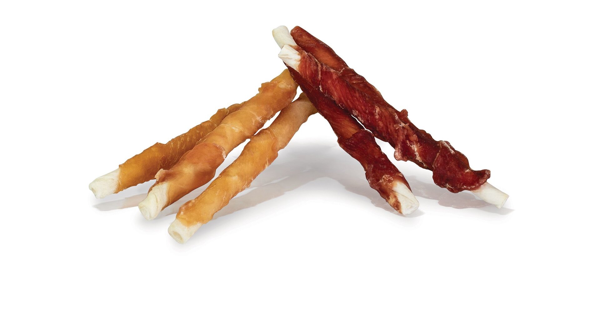 Gesunde Zähne; rohe Büffelhaut in Hühner- und Entenfleisch gewickelt; Verlockende und schmackhafte Belohnung