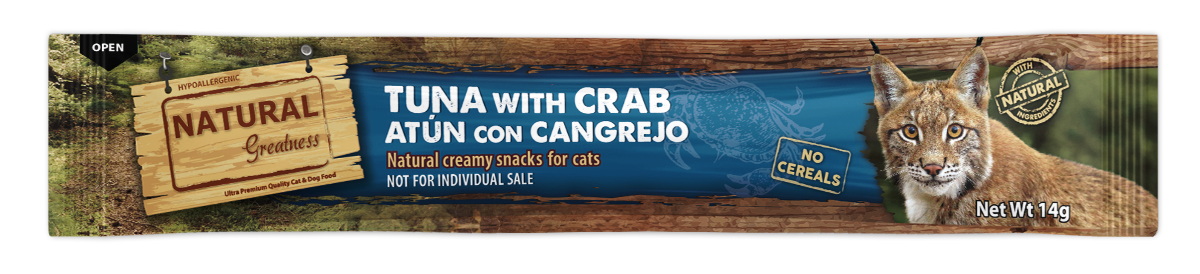 Natural Greatness Thunfisch-Krabben-Creme ist ein weicher, cremiger, getreidefreier Snack mit hochwertigem Thunfisch und Krabben, der mit Taurin, Vitamin E und Lachsöl angereichert ist und Ihrer Katze zu einer gesunden Haut und einem seidig glänzenden Fell verhilft.